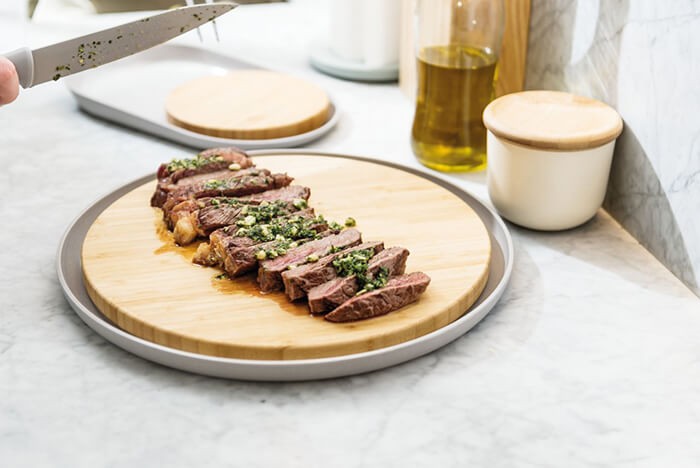 Обробна дошка виготовлена з бамбука, тарілка з бамбукового волокна. При обробці дошка вставляється в тарілку, де збирається сік з м'яса. Використовуйте предмети окремо як дві стильні тарілки, щоб подати страви на пікніку: бамбукову – для м'яса, другу – для будь-яких інших видів закусок.
