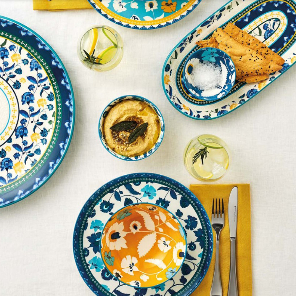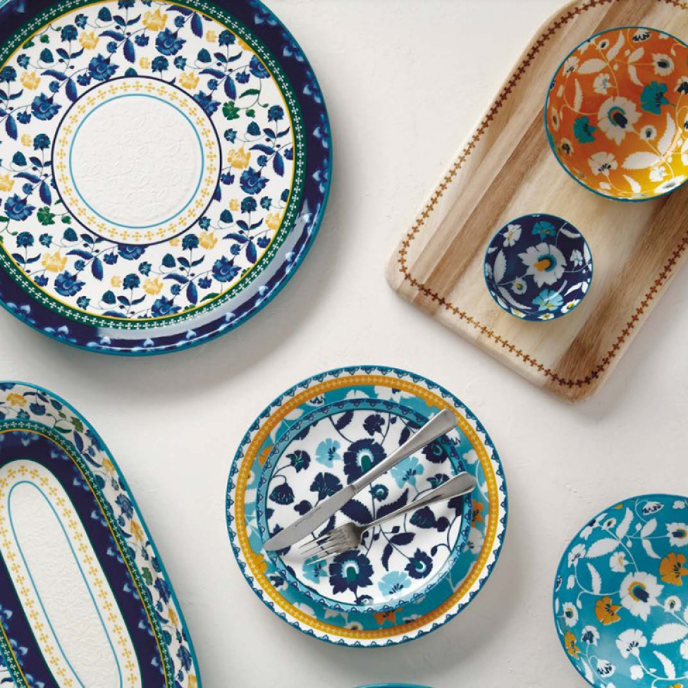 Колекція RHAPSODY BLUE від Maxwell & Williams включає широкий асортимент сервірувальних блюд, тарілок і мисок різних форм і розмірів. Доповнюють серію кружки і практичні підставки для ложок. Пишний квітковий декор віддає шану середземному способу життя і поєднує в собі блакитні, синьо-зелені та сонячно-жовті відтінки.