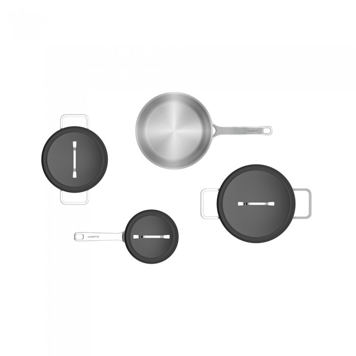 Особливості: корпус всіх предметів виготовлений із переробленої нержавіючої сталі; 3-х шарове капсульне дно забезпечує швидке нагрівання та рівномірний розподіл тепла; на внутрішніх стінках каструль нанесено розмітку об'єму; стильні кришки з чорного тонованого скла з вбудованим повітроводом та функцією фільтрації; завдяки скляним кришкам можна стежити за приготуванням страв; підходять для всіх типів плит, включаючи індукційні; підходять для використання у духовці; температурна стійкість до 250°C; температурна стійкість кришок до 180°C; легко очищаються