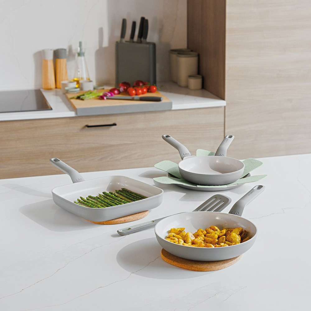 Особливості: 100% перероблений алюміній; 100% екологічне та безпечне для здоров'я керамічне антипригарне покриття CeraGreen, яке дозволяє смажити практично без олії; 2-х шарове цільнодискове дно для швидкого та рівномірного розподілу тепла та енергоефективного приготування їжі; легкий матеріал; ручки, що не нагріваються, для додаткового комфорту та безпеки; легко очищаються; у ручках є отвір для вертикального зберігання; підходять для всіх типів плит, включаючи індукційні; не підходить для духовки; лопатка виготовлена із переробленого пластику; термостійкість до 220°C; підходить для перевертання м'яса, овочів, риби, для смаження млинців та яєць; ідеальна для посуду з антипригарним покриттям; зручна м'яка ручка має петлю для підвішування