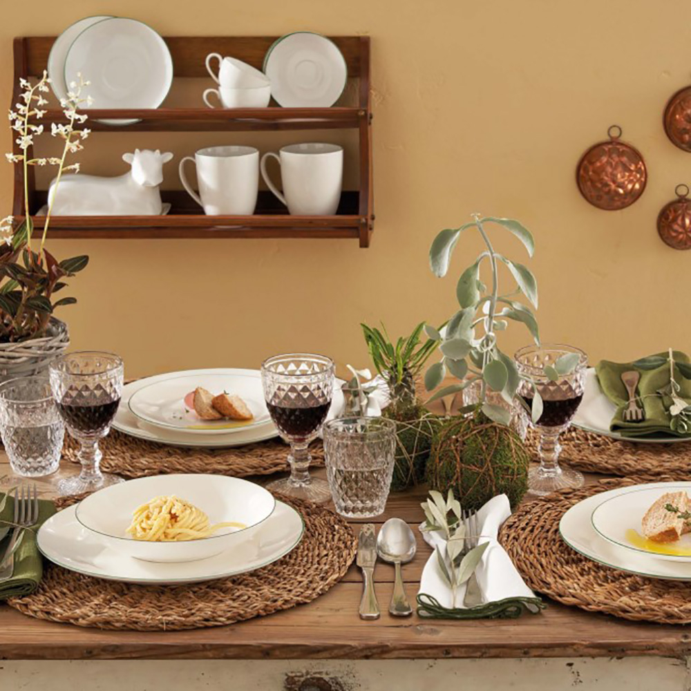 Колекція Dintorno вишукана у своїй простоті! Чиста білизна порцеляни чудово поєднується з витонченим контуром тосканського зеленого кольору, що оточує виріб, підкреслюючи його. Dintorno - посуд поза часом, що підходить для будь-якого святкового випадку. Вся серія виготовлена з порцеляни найвищої якості італійського виробника La Porcellana Bianca.