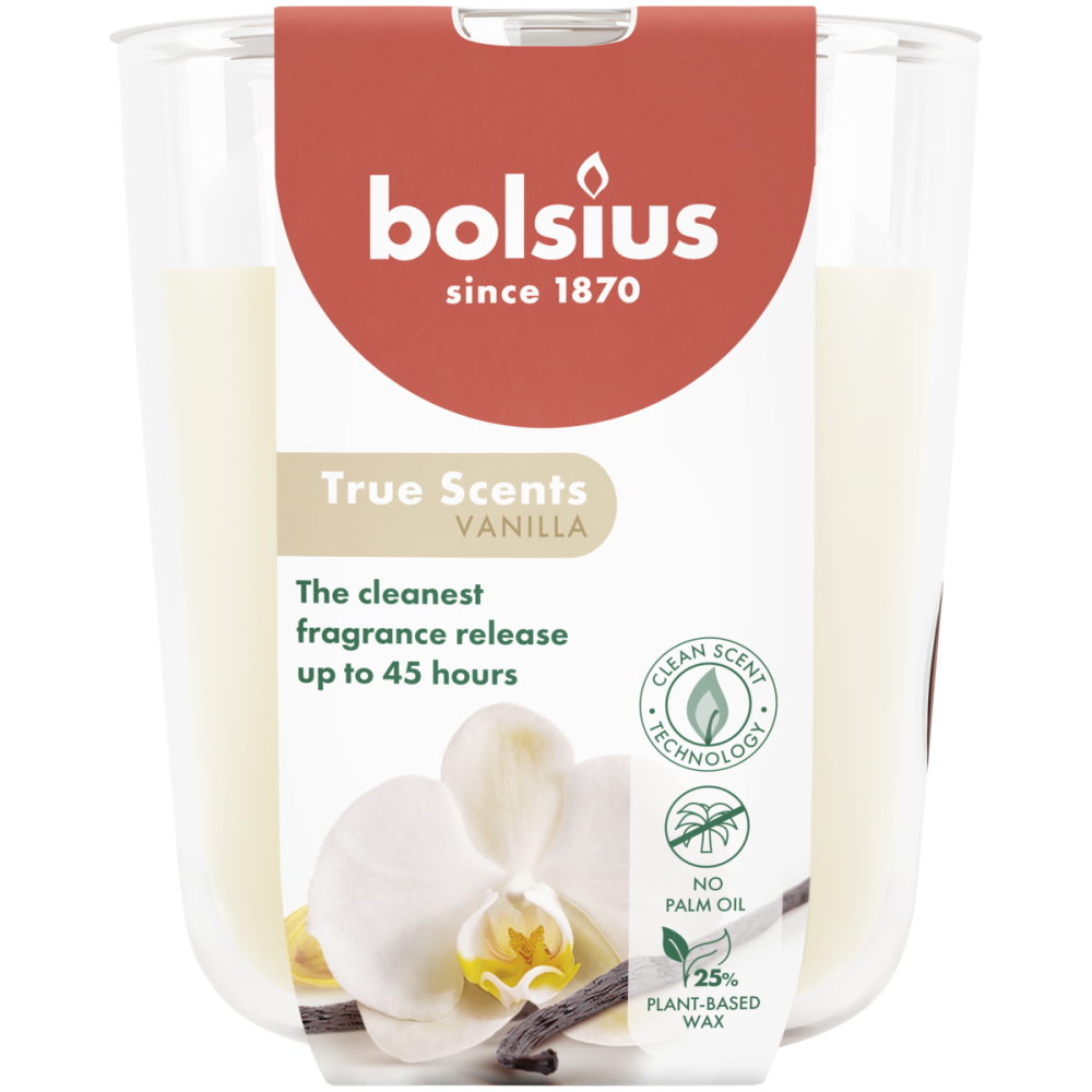 Велика ароматична свічка кольору слонової кістки з ваніллю від Bolsius поміщена в прозоре скло та горить цілих 45 годин. Цей приємний, кремовий аромат допоможе вам створити чудову домашню атмосферу. Створена за допомогою технології CleanScent, ми гарантуємо найчистіший аромат та найчистіше вивільнення аромату. Насолоджуйтесь ніжним ароматом ванілі, вільним від небажаних речовин, у затишку власного дому.