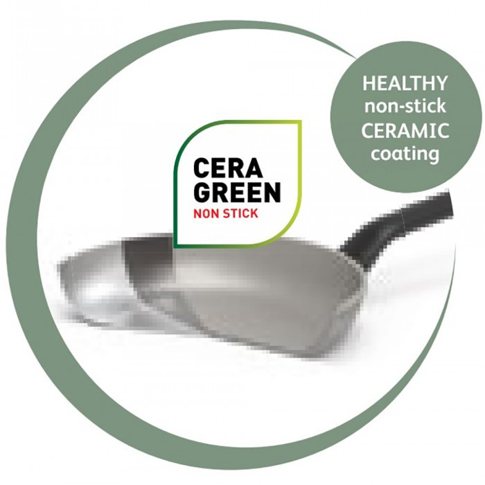 Особливості: 100% перероблений алюміній; 100% екологічне та безпечне для здоров'я керамічне антипригарне покриття CeraGreen, яке дозволяє смажити практично без олії; 2-х шарове цільнодискове дно для швидкого та рівномірного розподілу тепла та енергоефективного приготування їжі; легкий матеріал; ручки, що не нагріваються, для додаткового комфорту та безпеки; легко очищується; вбудований зливний отвір, який одночасно служить паровим клапаном; спеціальна ручка на кришці, на яку можна покласти ложку; підходить для всіх типів плит, включаючи індукційні; не підходить для духовки