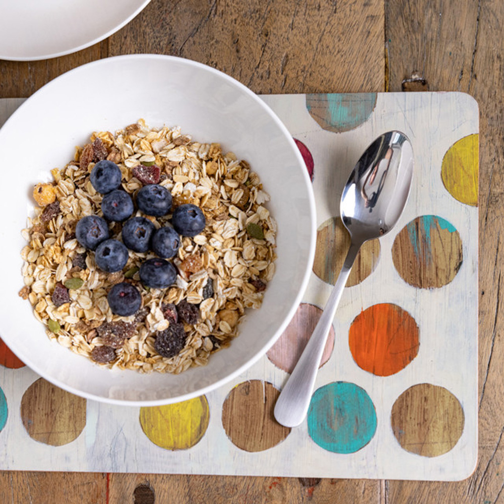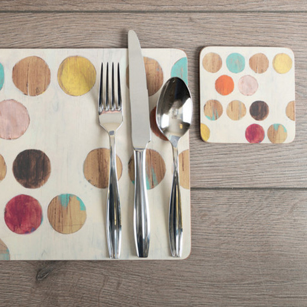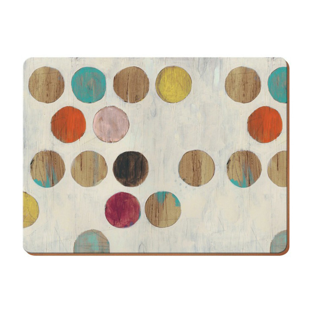 Особливості: підставки для тарілок на пробковій основі прикрашені кумедним дизайном Retro Spot на кремовому полотні; ефект шорсткої дерев'яної поверхні проступає крізь кола в дизайні, роблячи його тривимірним; захистять кухонні поверхні та обідній стіл від пошкоджень; завдяки натуральній сировині та високій якості не потрібний особливий догляд