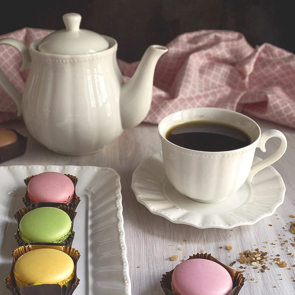 Тарілки, підноси та миски колекції Ducale відрізняються хвилястим краєм, що нагадує спокійні морські хвилі, з крихітними порцелянаовими намистинами, схожими на перли. У свою чергу молочники, чашки та чайники виконані у класичному дизайні з витончено декорованою ручкою, яка надає посуду легкість та сучасність. Всі вироби виготовлені з порцеляни найвищої якості італійського виробника La Porcellana Bianca.