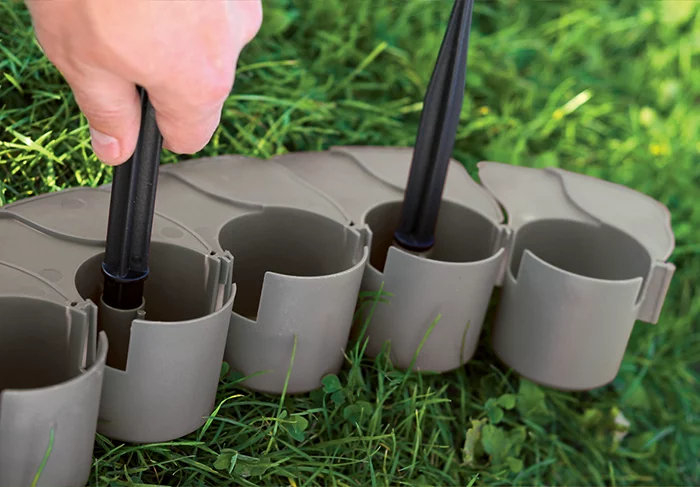 Зручний спосіб з'єднання елементів частоколу IPAL7 дозволяє вільно надавати йому форму, що робить його ідеальним для поділу, наприклад, квітників. Колеса косарки можуть пересуватися спеціальним буртом. Палісад виключно легко збирається та розбирається. Доступний у 4 кольорах.