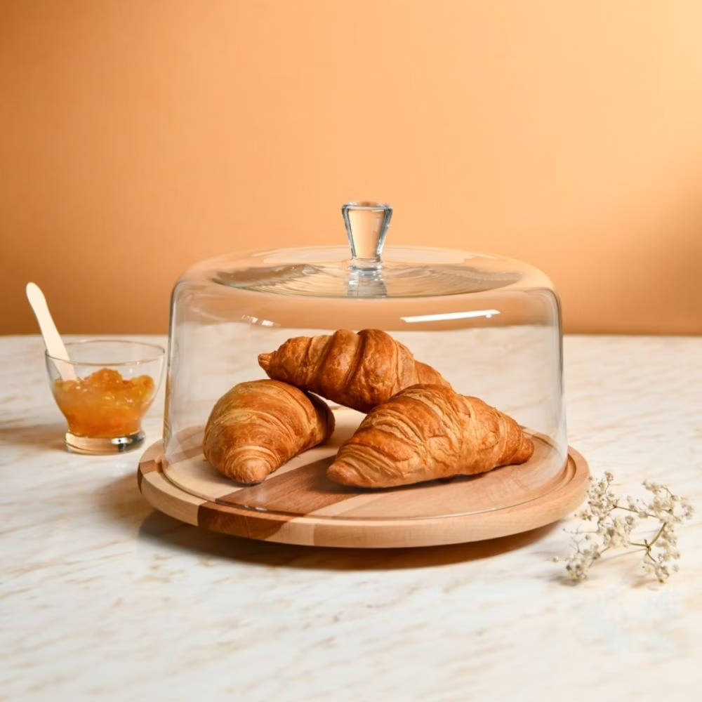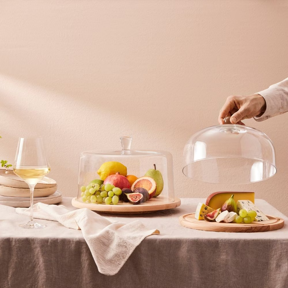 Дерево та скло чудово поєднуються, створюючи підставку для торта Glamour – позачасовий дизайн. Майстерність досвідченого склодува дозволила створити велику чашу ручної роботи з ідеально гладкою поверхнею, що полегшує очищення. Крім того, чаша містка та завдяки своїй геометричній формі забезпечує достатньо місця для зберігання. Це рішення дуже практичне та точно підійде навіть для багатоярусних тортів. Скляна чаша запобігає висиханню їжі. Обертова дерев'яна дошка, яку також можна використовувати окремо, пропонує широкий спектр можливостей. Ця опція зручна для декорування, нарізання та подачі тортів, а також дозволяє дістати, наприклад, скибочку сиру з протилежного боку, не встаючи з-за столу. Піднос виготовлений з букової деревини та просочений харчовими рослинними оліями. Обертова дерев'яна чаша діаметром 33 см з колекції Glamour від KROSNO – це обов'язковий елемент будь-якої вечірки.