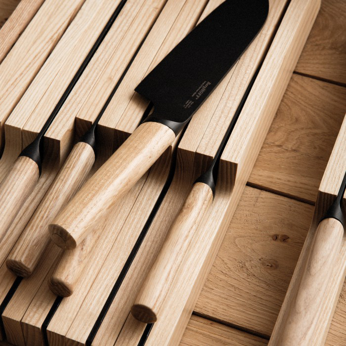 Підставка для ножів складається з магнітного елемента, розміщеного у міцному дерев'яному корпусі. Форма підставки зроблена таким чином, щоб користування ножами зробити максимально комфортною. Рекомендується протирати вологою серветкою.