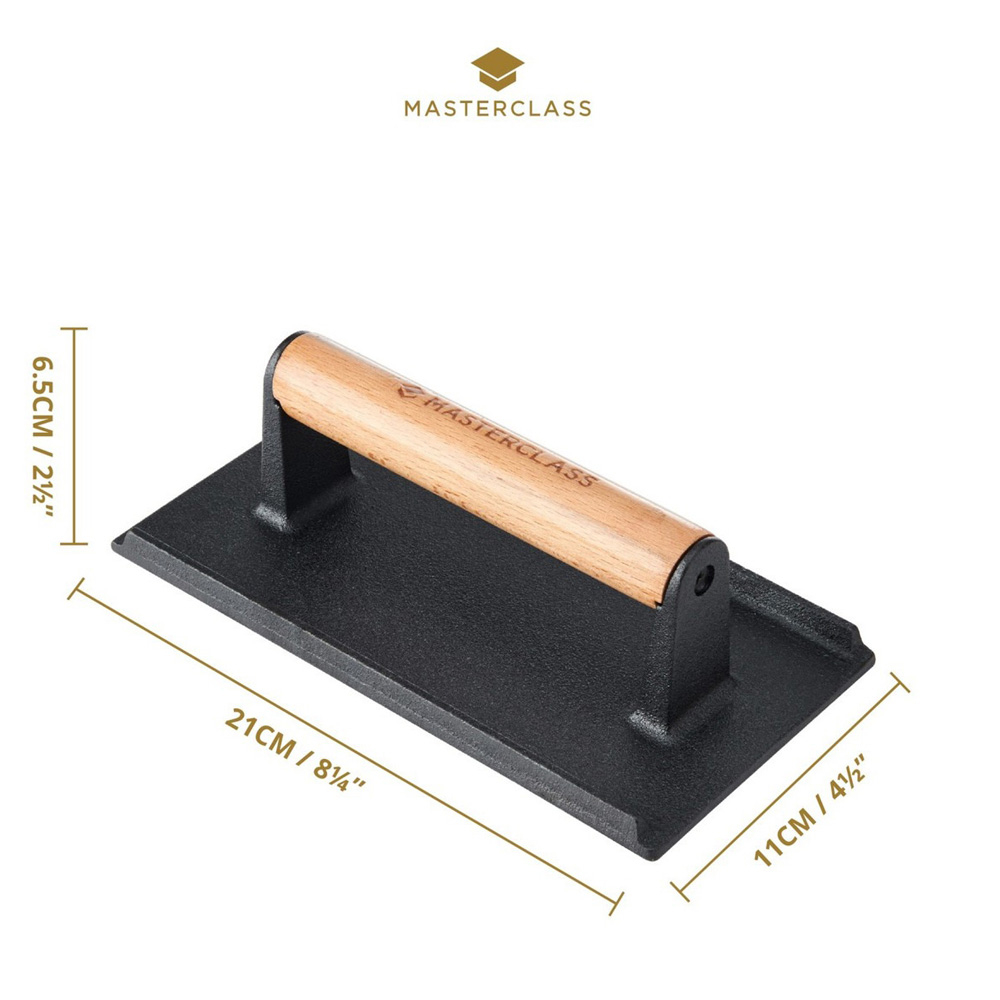 Особливості: прес виготовлений із міцного чавуну, відомого своєю здатністю довго зберігати температуру; підходить для використання на грилі, печі чи барбекю; завдяки міцному складу він вирівнює м'ясо, забезпечуючи рівномірне приготування, запобігає скручуванню волокон і забезпечує ідеальне прожарювання; дерев'яна ручка із логотипом бренду залишається прохолодною під час приготування; легко миється