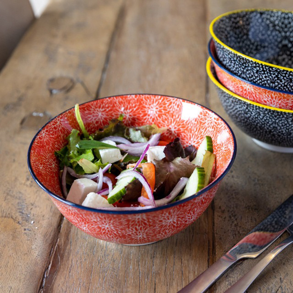Особенности: миски изготовлены из высококачественной керамики; удобны и многофункциональны - идеально подходят для порций каши, риса или лапши, для подачи гарниров, закусок и даже десертов; украшены цветочным или геометрическим дизайном с яркими оттенками; также каждое изделие имеет свой внутренний узор, вдохновленный простыми формами или штриховкой, что придает набору ощущение микса и сочетания; подходят для использования в микроволновой печи; подходят для ежедневного использования