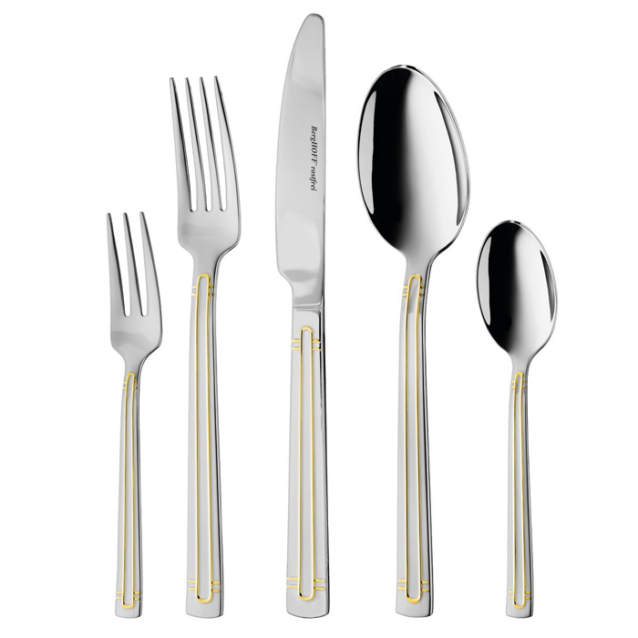 Авторская линия дизайнера Ральфа Крамера. Столовые приборы изготовлены из высококачественной нержавеющей стали 18/10. Набор на 6 персон включает все необходимые приборы, включая десертную вилку. Орнамент с позолотой на ручках и классическая форма - отличительная черта данного набора. Подходит для мытья в посудомоечной машине.