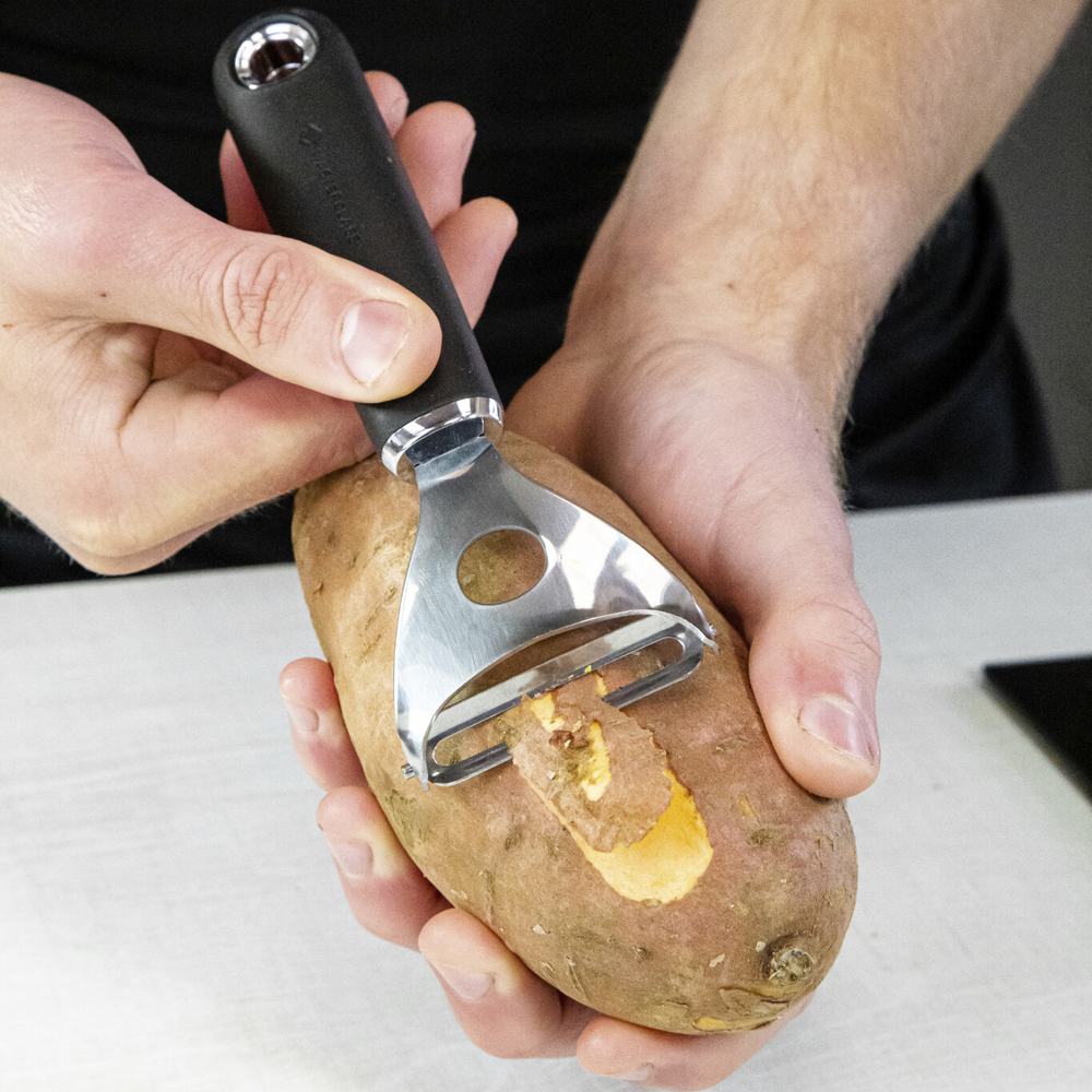 Особенности: идеально подходит для чистки овощей и фруктов; гладкая мягкая ручка MasterClass оснащена эргономичным упором для большого пальца, обеспечивающим контроль движения руки; основа из нержавеющей стали, которая устойчива к коррозии, запаху и пятнам; петля для подвешивания; хромированные акценты премиум-класса; стильная полированная поверхность