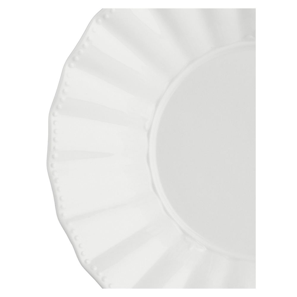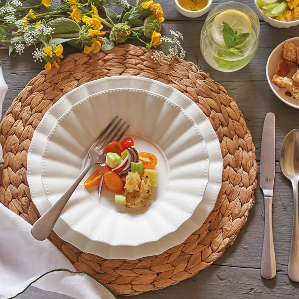 Тарелки, подносы и миски коллекции Ducale отличаются волнистым краем, напоминающим спокойные морские волны, с крошечными фарфоровыми бусинами, похожими на жемчуг. В свою очередь молочники, чашки и чайники выполнены в классическом дизайне с изящно декорированной ручкой, которая придает посуде легкость и современность. Все изделия изготовлены из фарфора высочайшего качества итальянского производителя La Porcellana Bianca.
